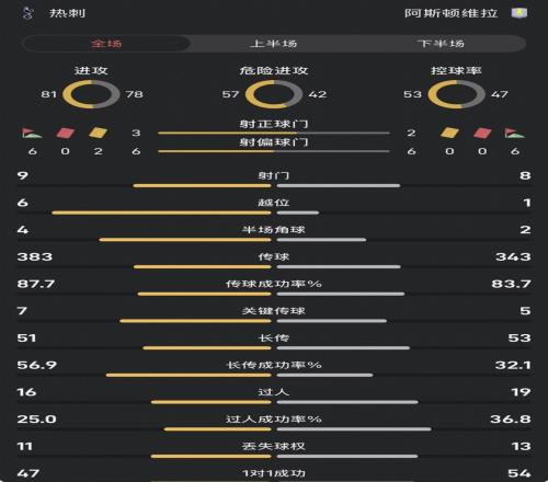 热刺vs维拉全场数据:控球率53对47,射门9对8