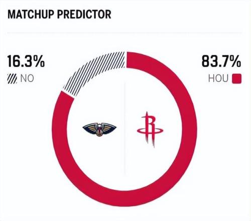 赛前,美媒ESPN对本场比赛进行了胜率预测,火箭队胜率依旧高达83.7%,占据绝对上风,鹈鹕胜率则仅有16.3%,还是不被看好。