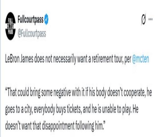 北京时间1月29日,据湖人记者Dave报道,詹姆斯并非一定要举办退役巡演。另外,骑士愿意促成詹姆斯第三次加盟球队,但也受到诸多因素的影响。